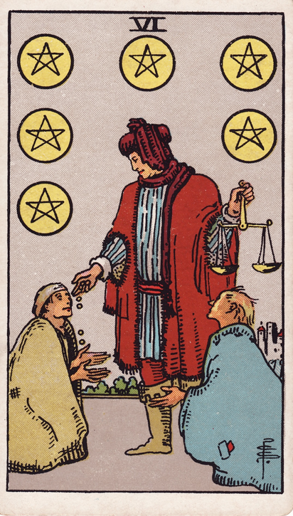 Alternately, we may have so much wealth and prosperity that we are the one in a position to help others. If we are in a difficult situation at the moment, this card can indicate that there is help available and that someone will assist or support IF WE REACH OUT. We may be feeling a strong sense of community spirit or compelled to help those around us when it appears in our Tarot spread. It is also a card of power and control so we may find ourself in a position of authority or being well-respected by others when it appears in our reading. The Six of Pentacles is usually a positive card to get as it can signify equality and fairness and can also symbolism being well paid, being valued or being rewarded for hard work. If we are prospering when it appears, we are wise to share our good fortune with those around us to keep the energy of the manifestation going!