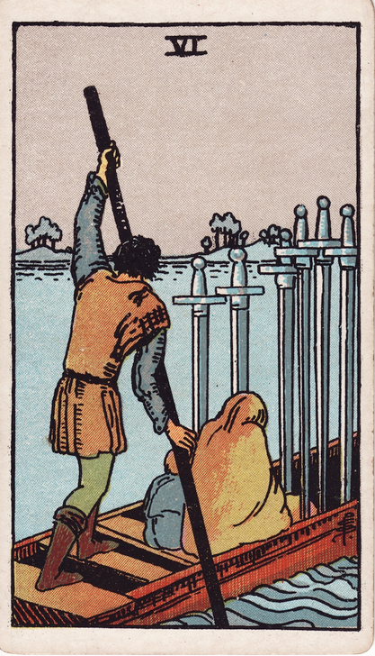 Six of Swords represents progress, moving into calmer waters after trauma, moving on or moving forward. Card of overcoming hardship, beneficial healing, relief and stability. If we have evolved consciously through the traumas we Expereince, we can expect problems in our life to settle down and things to be much easier to deal with when this card shows. The Six of Swords can also represent escaping, running away, —a sign of being unhealed or un-evolved. It indicates journeys, travel, traveling overseas and going on holiday with others. It can sometimes signify feeling lethargic and deflated after coming through a tough time or the calm after the storm. It is also a Tarot card of intuition, inner guidance and spirit guides.