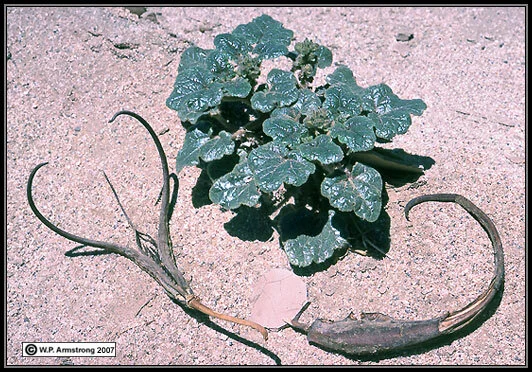 Most commonly known as "devil’s claw," this desert hitchhiker that was introduced a few months ago and is also called "elephant tusks" or "unicorn plant." Each name refers to the plant’s seed pod. The first two names allude to the woody capsule, which splits open at one end into two curved claws or horns. Before the pod splits, the green, fleshy fruit superficially resembles a unicorn’s horn.